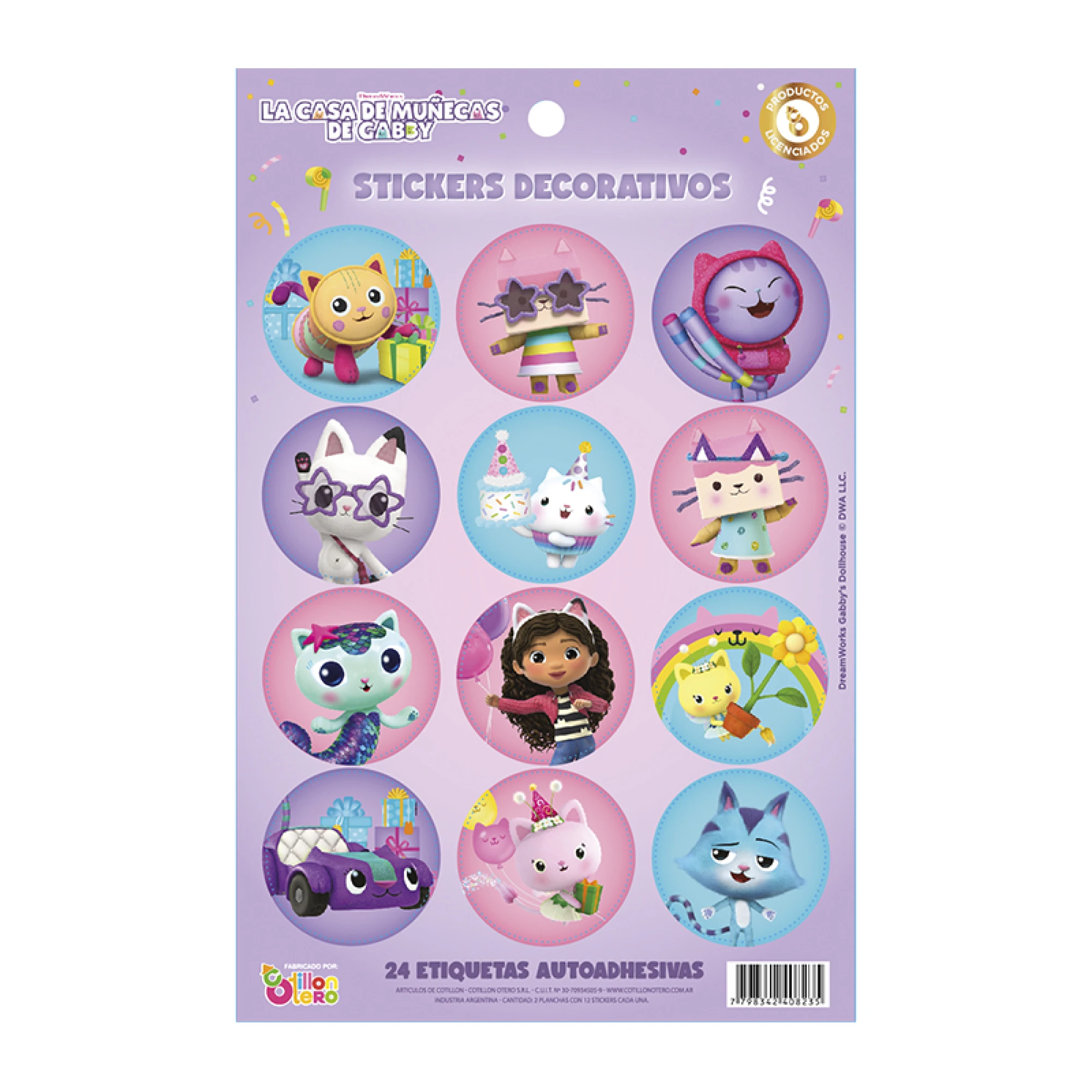 Adhesivos/ Stickers de cotillón con el diseño de La Casa de Gabby, producto oficial del dibujo animado. El pack viene con 24 unidades, 12 x cada lado.